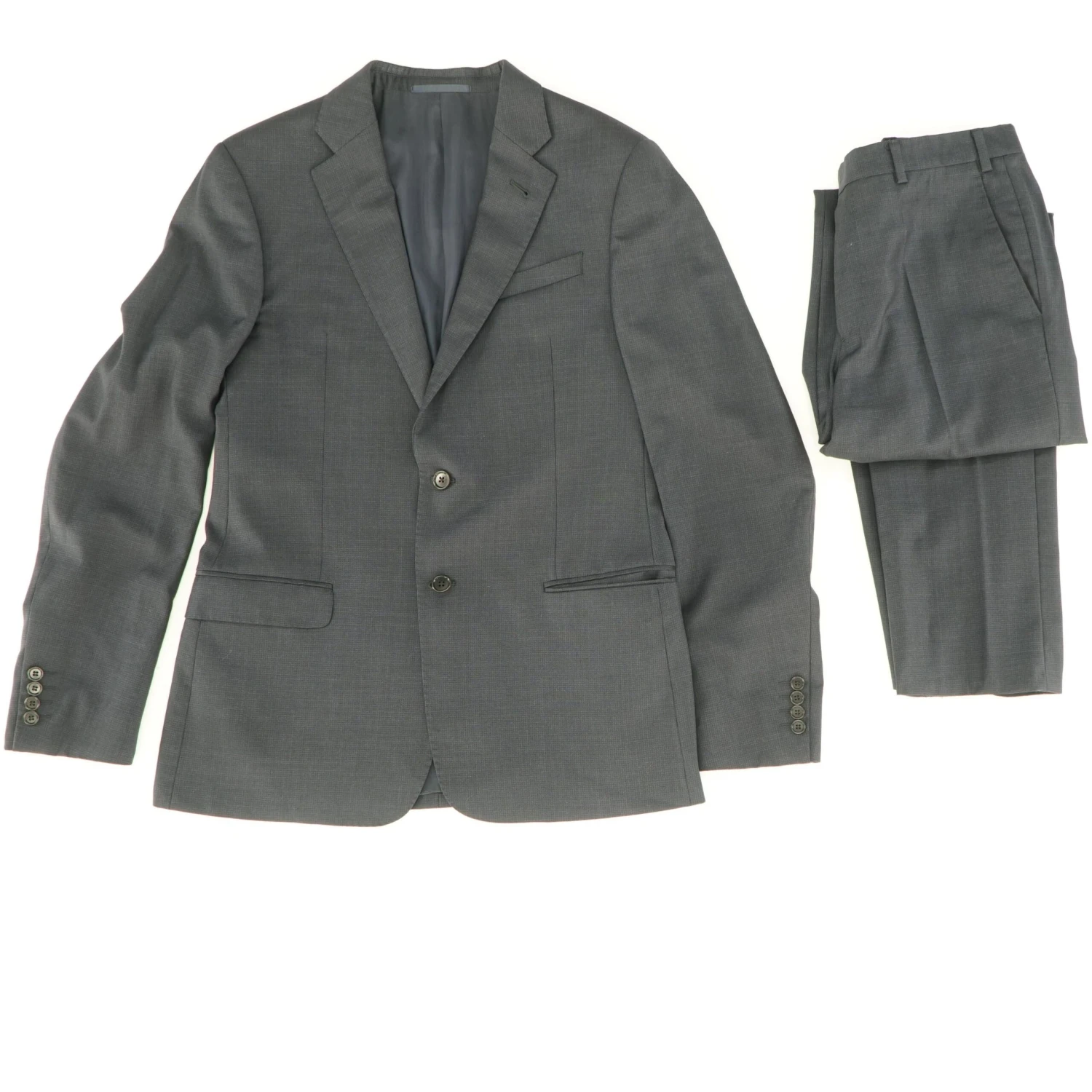 This dapper wool suit is accented with a textured finish. A single breasted two-button coat, with a slim fit flat front pant. Made from 100% wool.